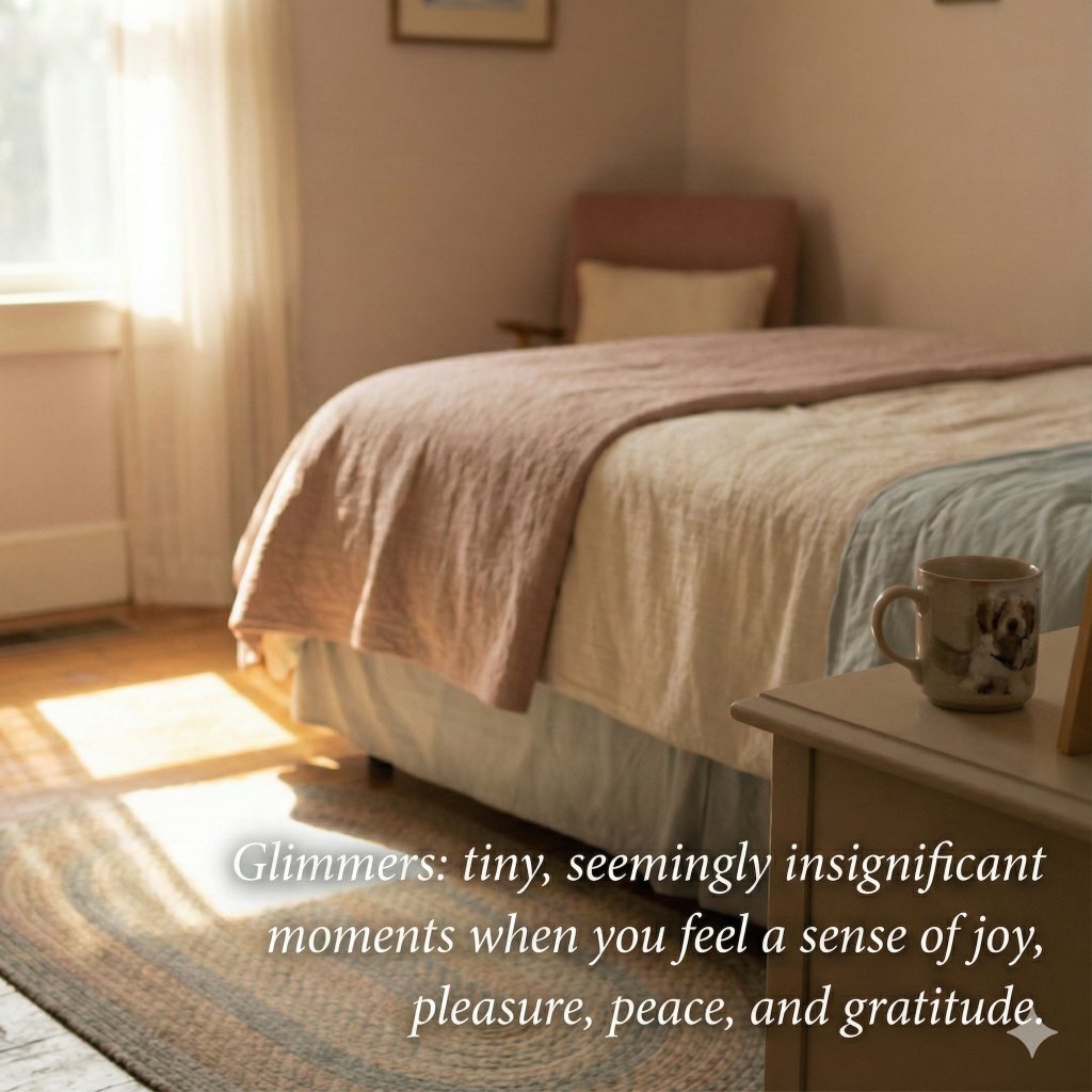 - Paying attention to glimmers when you notice them: If you do find a glimmer in your day, how does it make you feel? What happens to your body?